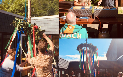 dachten sich Klienten und Mitarbeiter der Tagesstätte. Daher wurde im Rahmen des Frühlingsfestes ein Maibaum im Innenhof der Einrichtung aufgestellt. Hatte man schon im Vorfeld viel Spaß beim Schmücken des Kranzes, so erlebte die Prozedur ihren Höhepunkt, als mit Gitarrenmusik und Bongospielen der Stamm durch den Flur getragen und