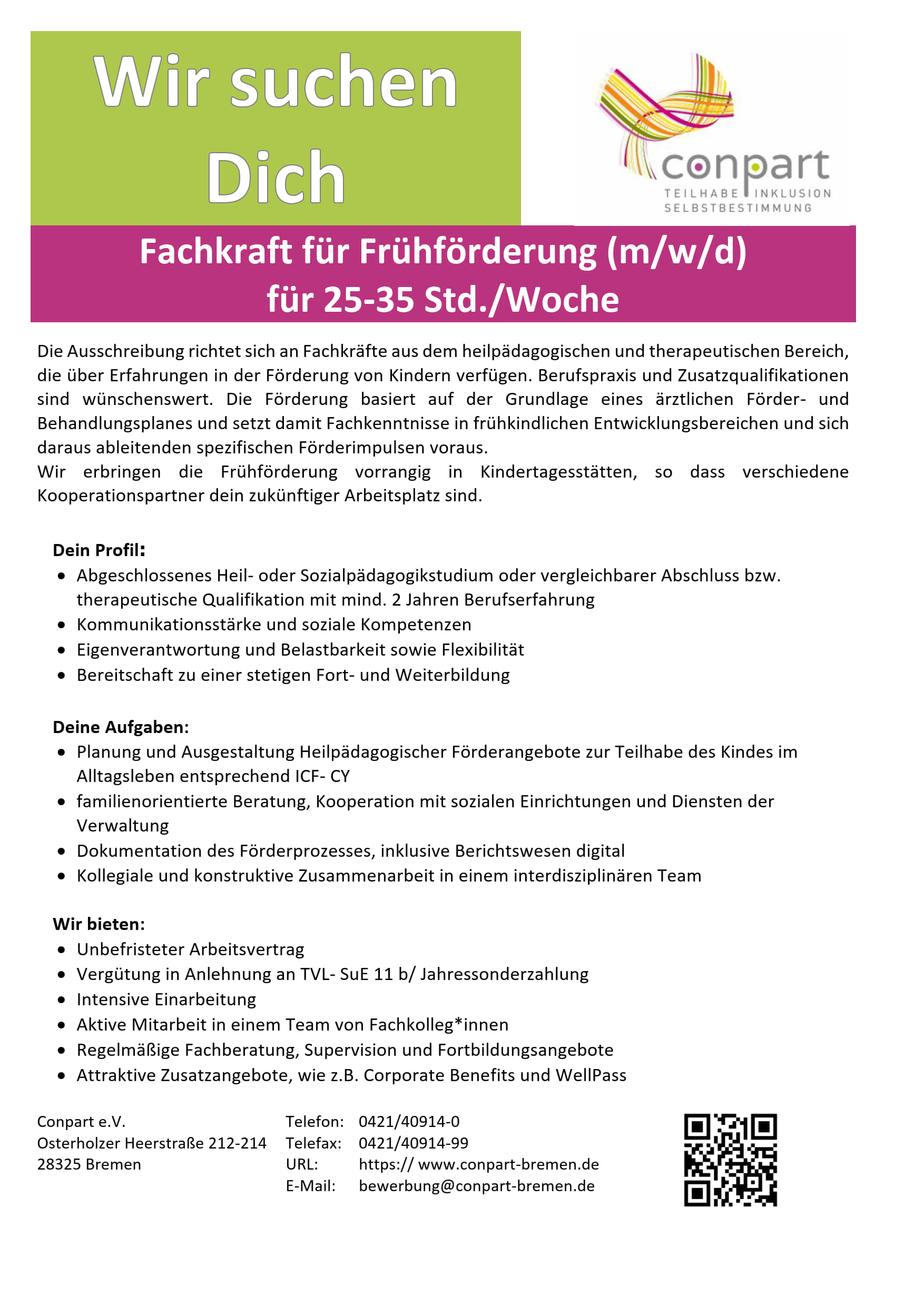 Die Ausschreibung richtet sich an Fachkräfte aus dem heilpädagogischen und therapeutischen Bereich, die über Erfahrungen in der Förderung von Kindern verfügen. Berufspraxis und Zusatzqualifikationen sind wünschenswert. Die Förderung basiert auf der Grundlage eines ärztlichen Förder- und Behandlungsplanes und setzt damit Fachkenntnisse in frühkindlichen Entwicklungsbereichen und sich daraus ableitenden spezifischen Förderimpulsen voraus.